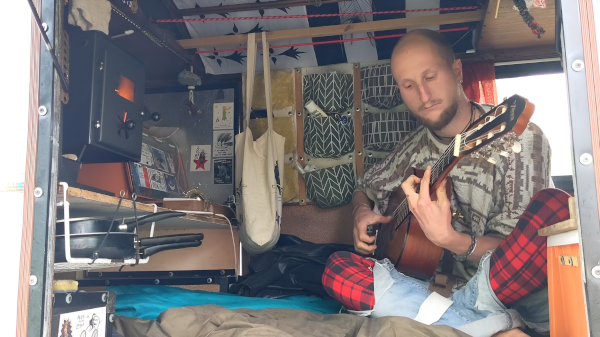 Après le confinement, Romain délaisse son camion et fabrique une roulotte qu’il accroche à son vélo couché pour sillonner les routes et partir à la rencontre des gens. Sa vie tient dans deux mètres carrés qu’il déplace uniquement grâce à la force de ses jambes, à travers la France, mais aussi l’Europe. « Le plus important c’est de s’écouter soit en fait et de trouver sa place, il n’y a pas une façon de faire idéale, c’est juste tout un tas de petites choses assemblées qui font une vie… Y’a pas une solution, une voie toute tracée, y’a que des expérimentations, un chemin à construire, à explorer petit à petit… » Romain, cyclo-roulottier